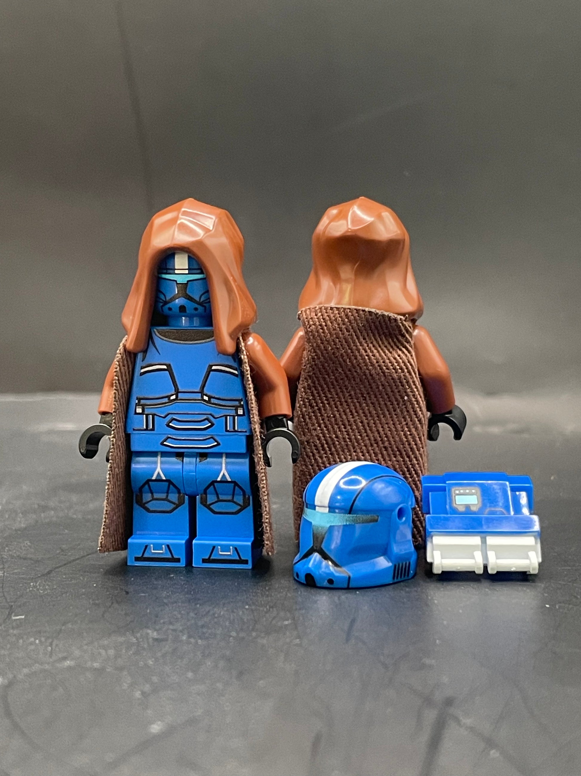 Features TheBrickWay brown trench coats. Comes with two pairs of arms, blue and brown.