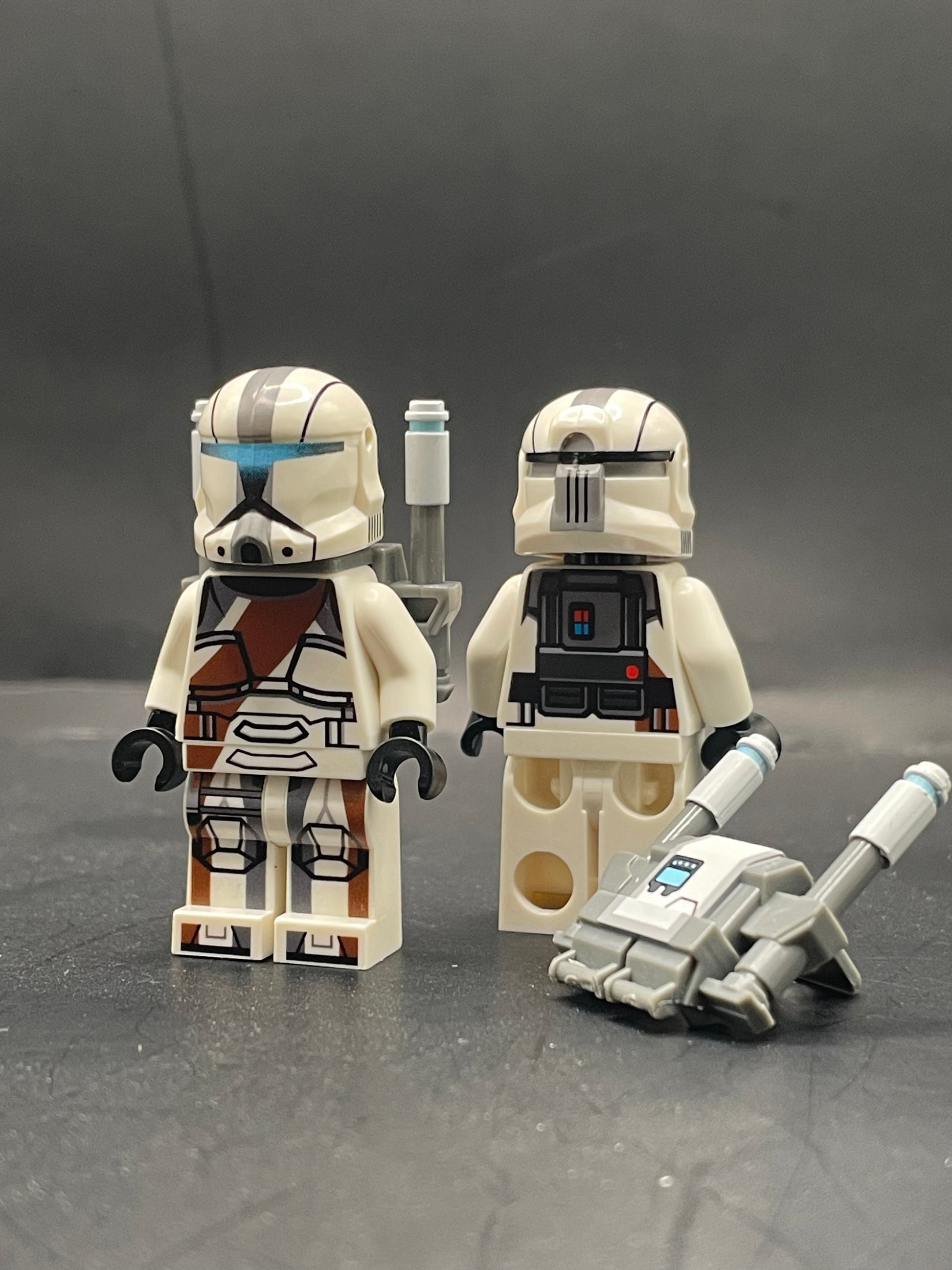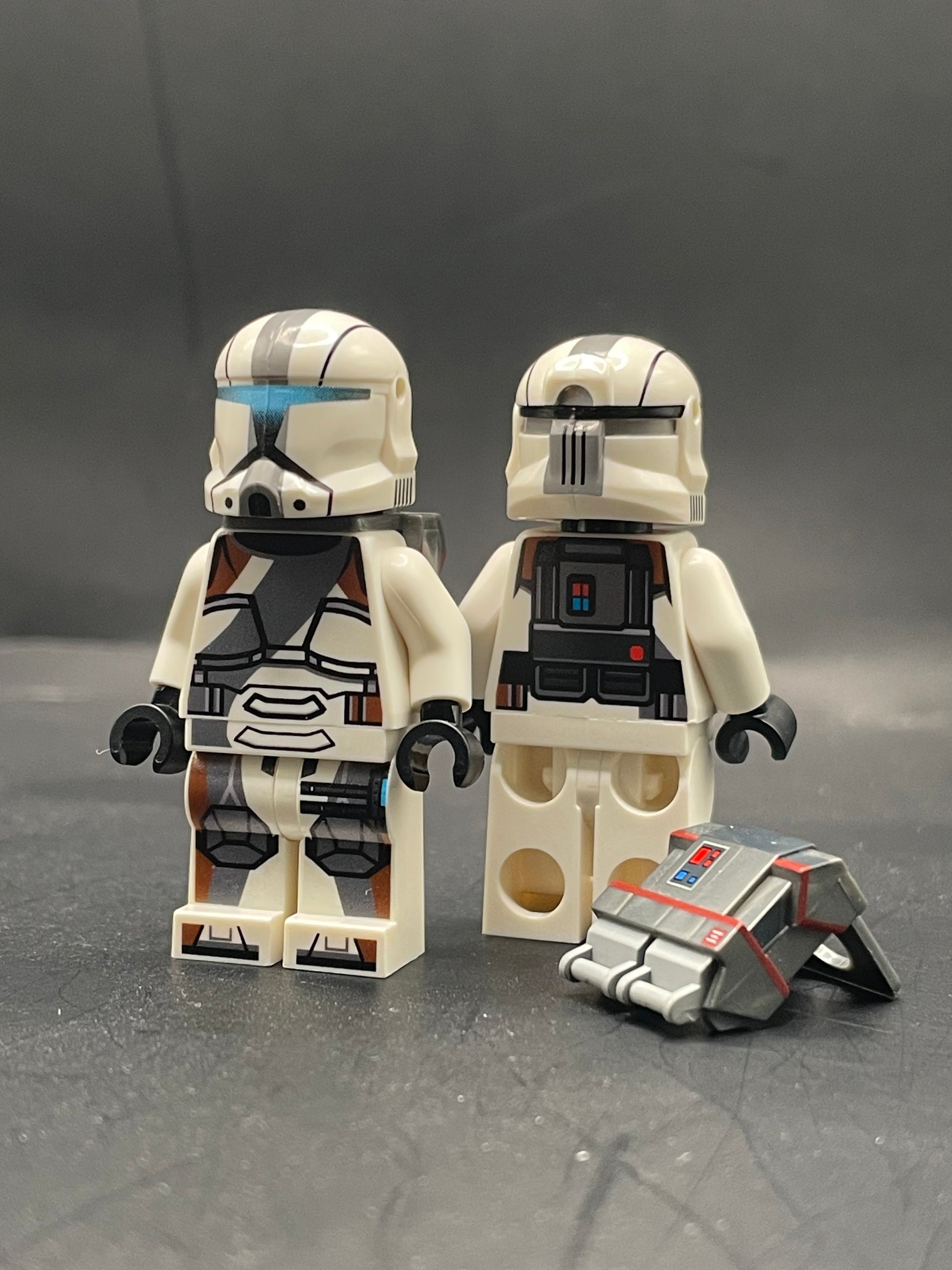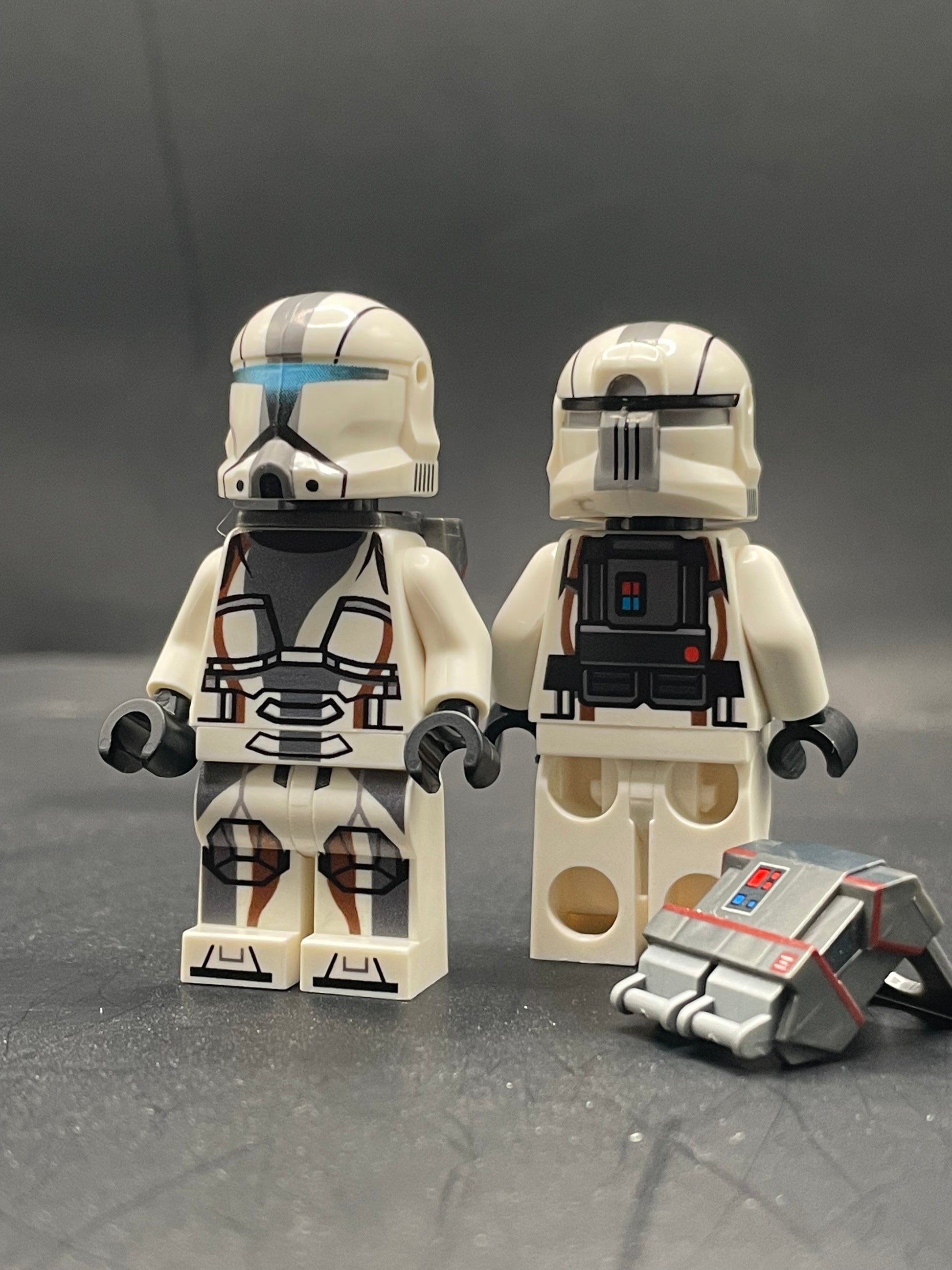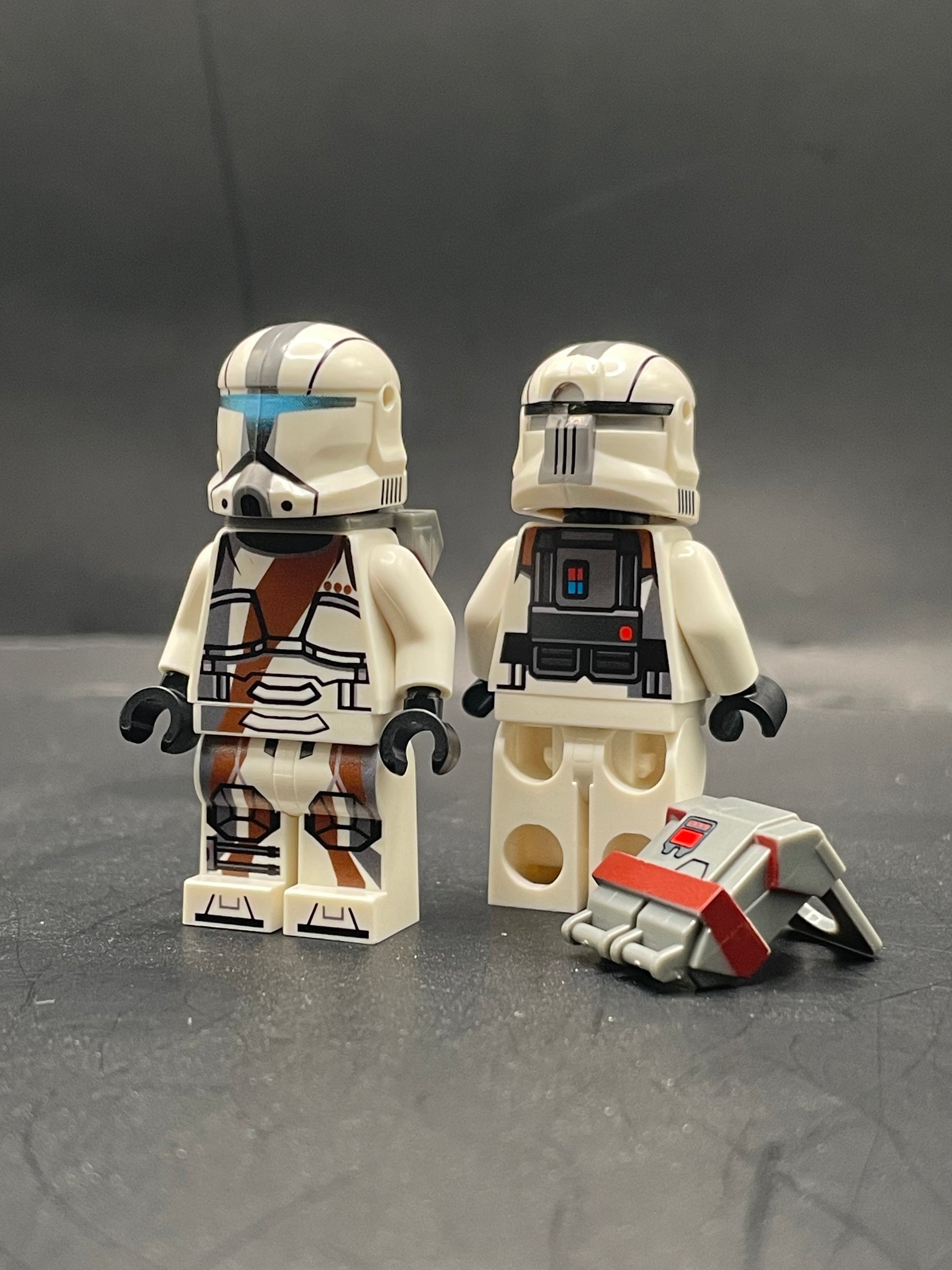 Helmets and backpacks are pad printed on custom molded pieces.